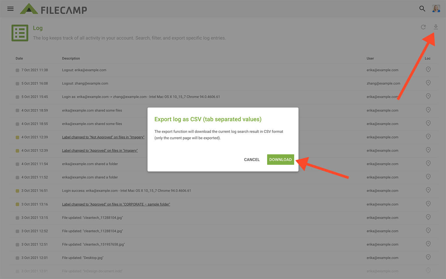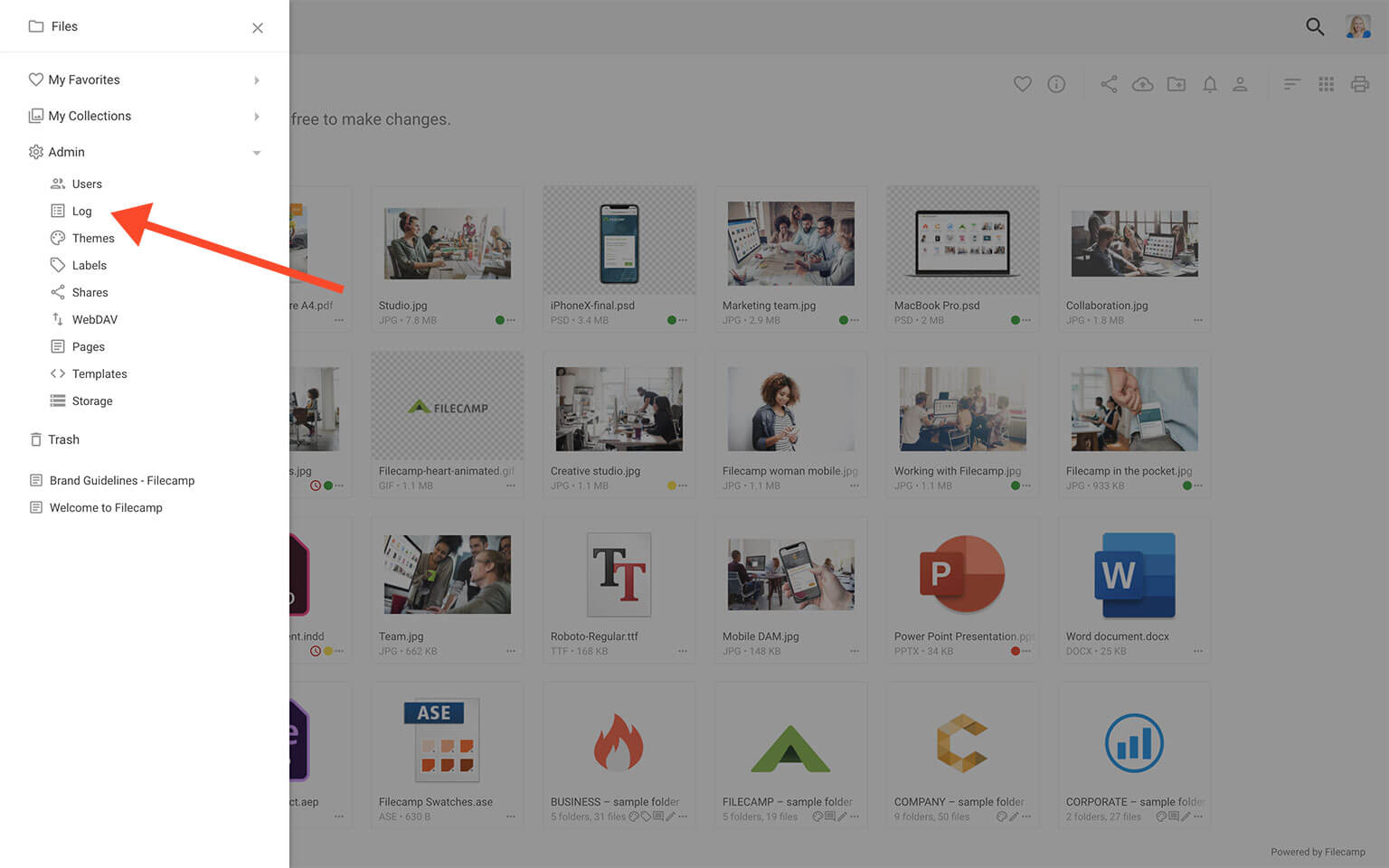 The log is a powerful tool that keeps track of everything that happens in your Filecamp account. You can view, filter, and export activity reports to help keep track of your Filecamp usage.