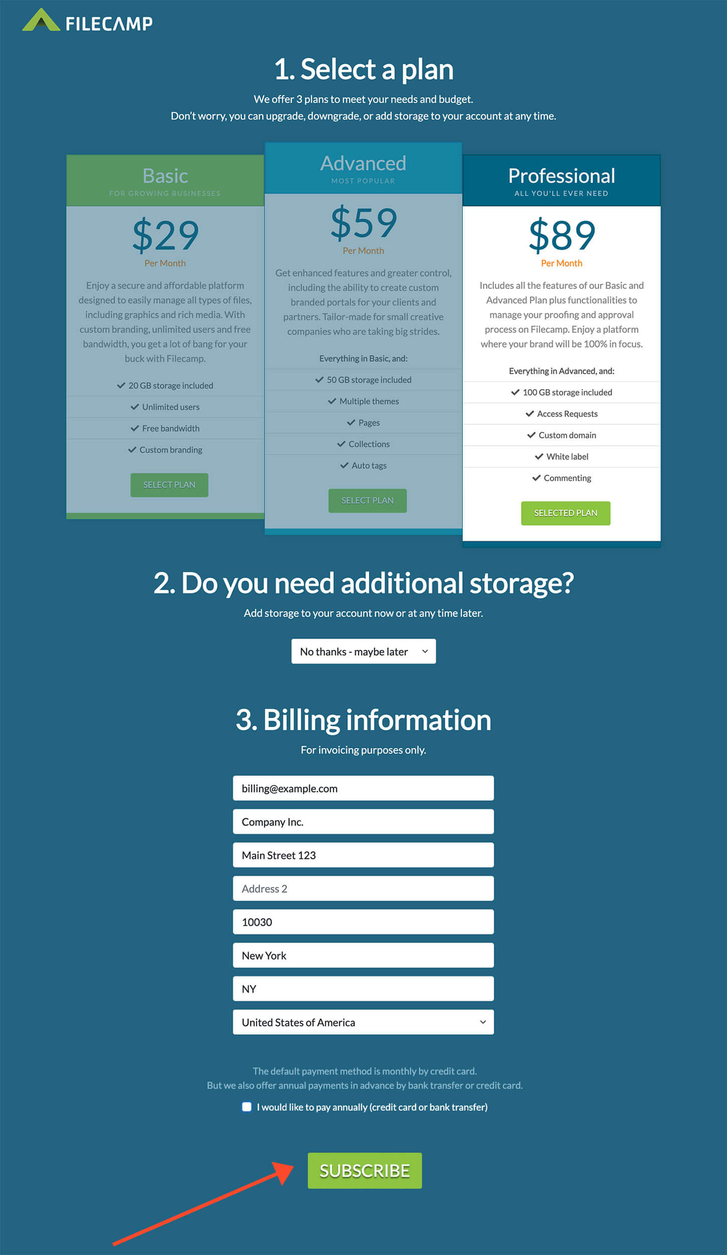 The default payment method is monthly by credit card. But if you prefer to pay annually, you can check the checkbox and you will see some more options.