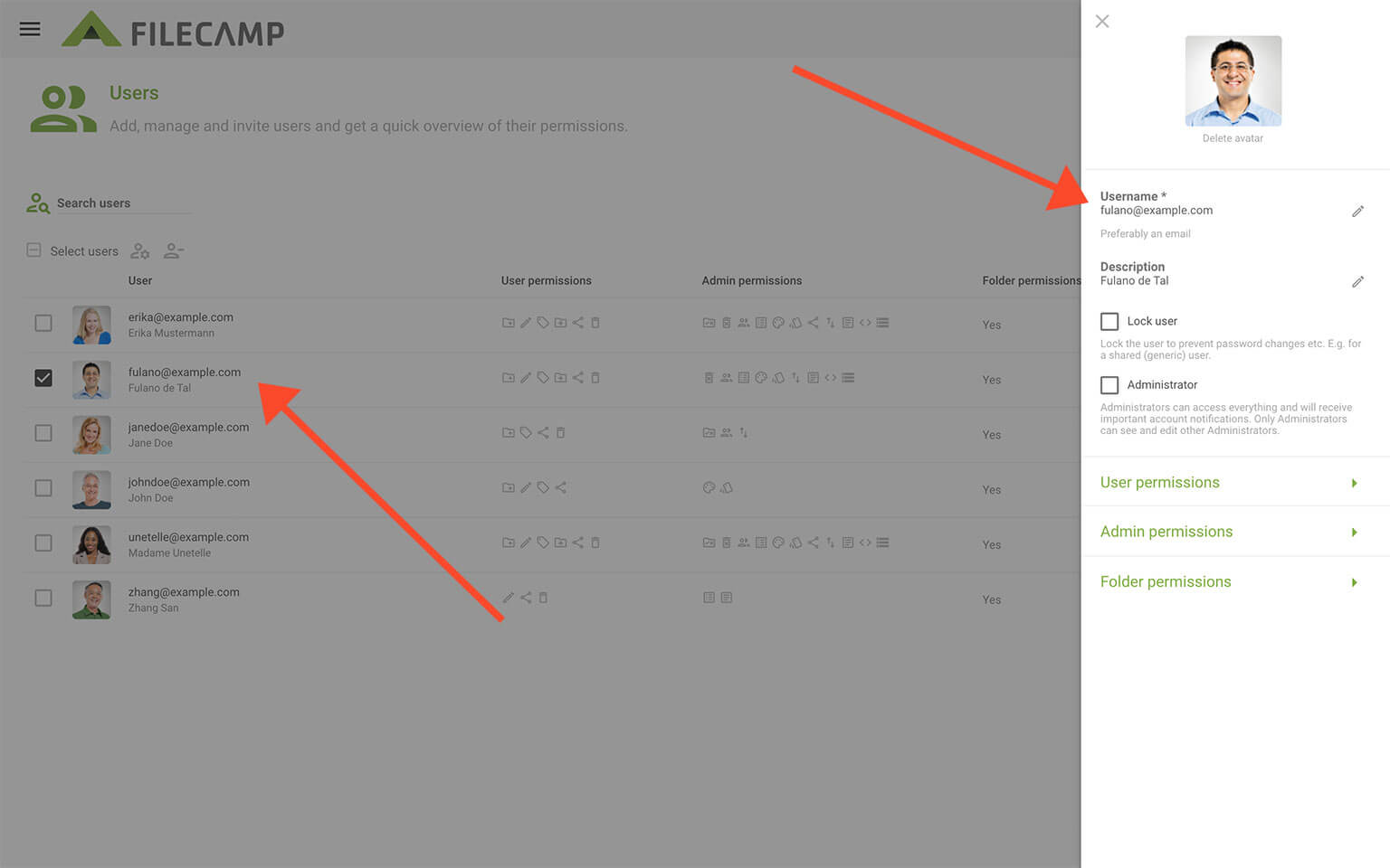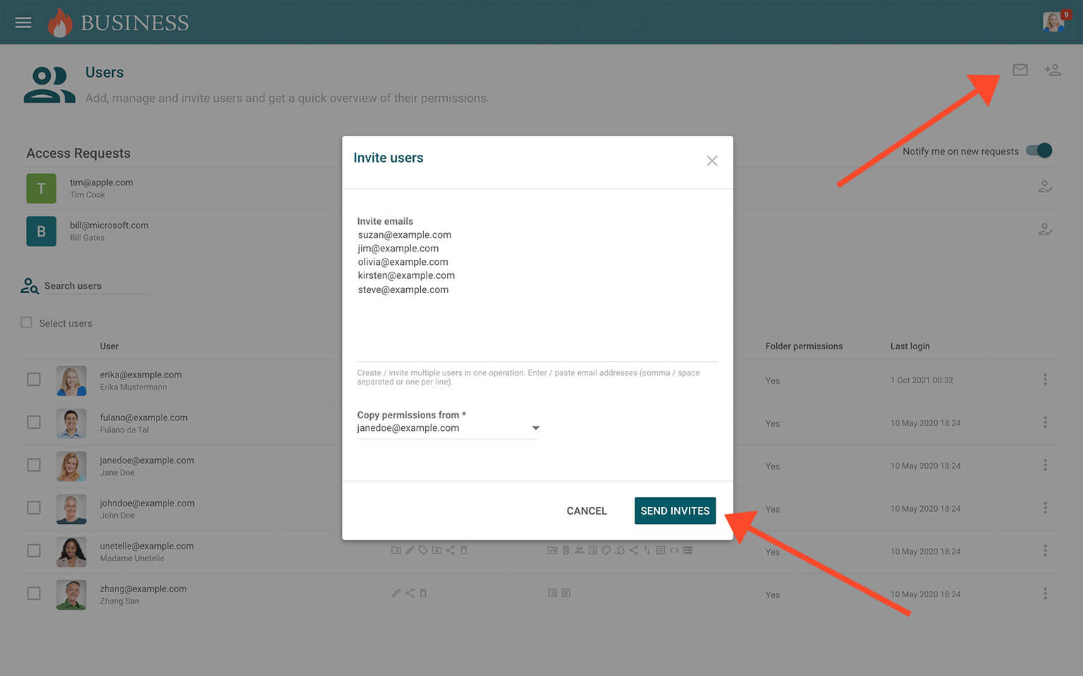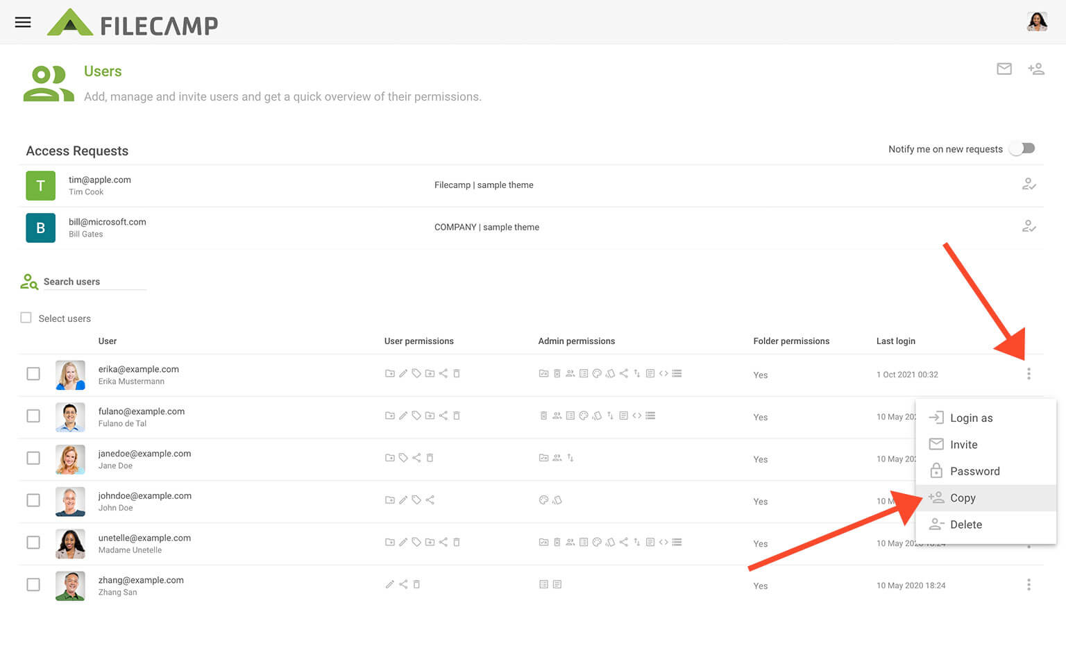 Administrators and users with permission to "Manage users" can add, invite and manage users. You can control folder permissions, ensuring users access only the files and folders you want them to access.